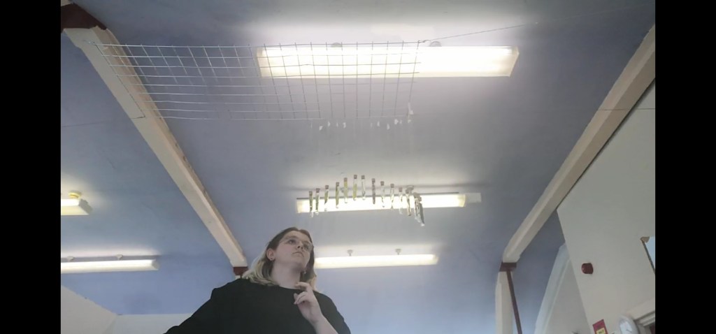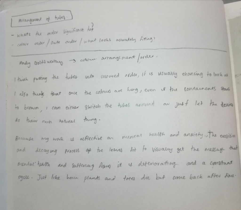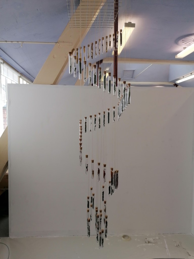 My aim was to try express my view of how I see my own mental health and its course. The attractive areas would be the scale and the order of the installation, however in my views that’s to try replicate that overwhelming sense of something bigger than I am which is hard to keep contained and organised.