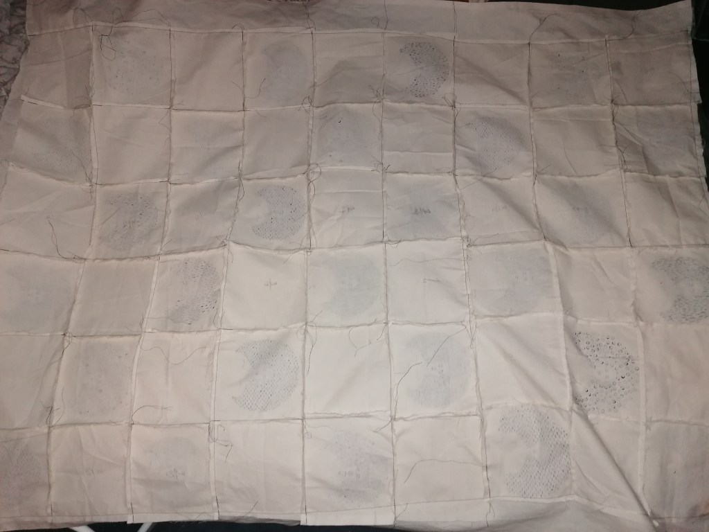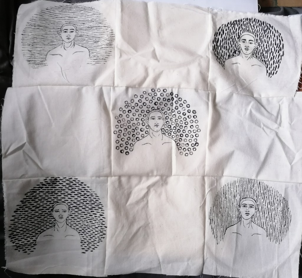 The blanket consist of 54 fabric squares, 27 of them will be the portraits. I decided that having spaces between the portrait pieces would be better in terms of production time, because the portraits are all hand painted they take some time to do(30/40 mins each). I also decided to just stick with the same repetitive patterns to maintain a neatness in the work, but also to keep the black marks bold, I noticed before that when I used a smaller textured object (like the shell) the markings didn’t come out as striking as I wanted them to. So I stuck to using markings I knew wouldn’t disappoint in that area.