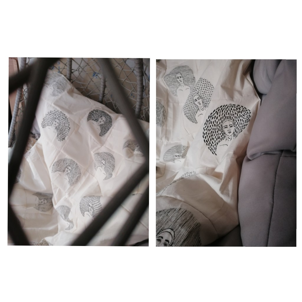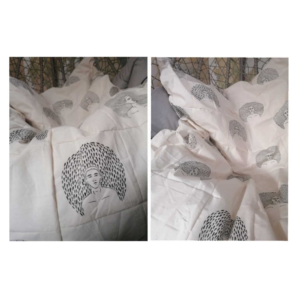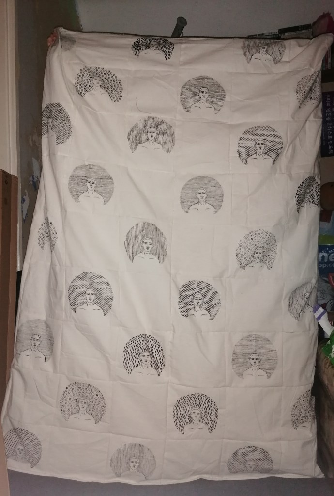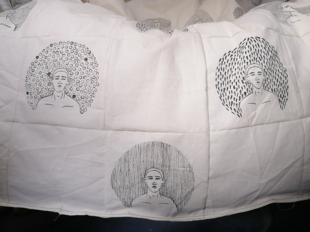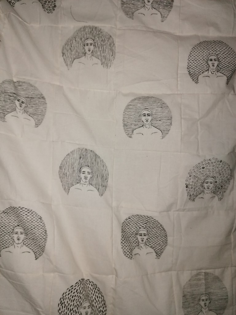 I eventually found a method of making portraits in a scale and pattern that I liked and thought could look effective, centring the portrait around unidentified markings that are supposed to represent how fear surrounds us when faced with our fears. I decided on using a bold colour such as black because the colour contrasted well with the off white colour of calico, and because of the portraits form, it made the surroundings of the portrait seem powerful, which is what I’m trying to visually express with how fear effects people and how it can make one feel. I kept producing more of the portraits and that when using multiples entered the idea of things, and that worked well because making a blanket with multiple portraits could work. The production of making the blanket were interesting and time consuming because everything was hand drawn, cut and painted, except from when it came to sewing the blanket together.