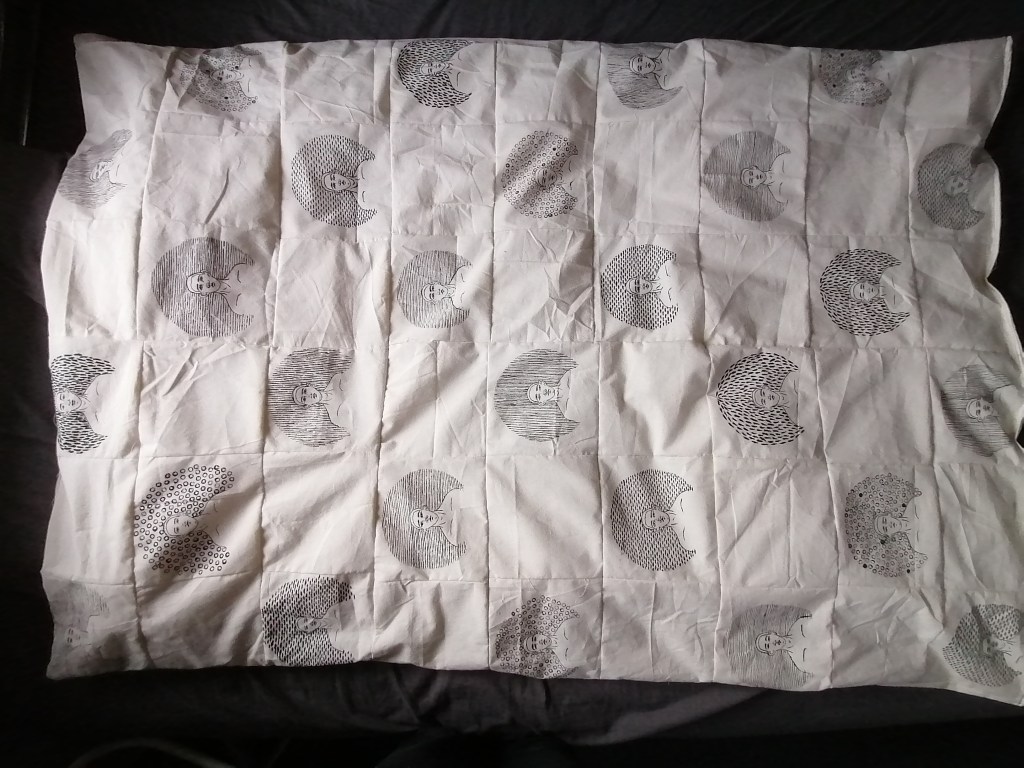 After sewing the blanket together and turning it inside out to form a giant sleeve, I stuffed the blanket to size inside the sleeve and sewn the blanket shut to conceal the blanket together fully. I think If I had the time and materials to do so, I would have made button holes and use buttons to close the blanket up so I could easily change the quilt if needed, but this method was quicker and I don’t have the buttons to do so.