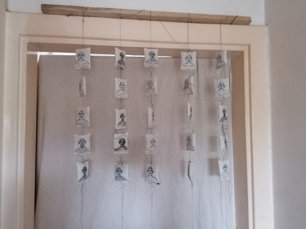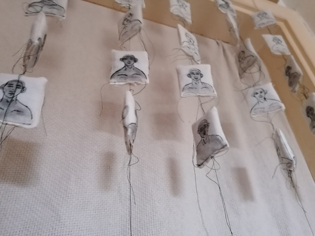 After I had painted all the portraits and arranged them into 6 groups of 9 square pieces, that’s when I began to tack the pieces together to form a larger piece of fabric like the image is showing above.