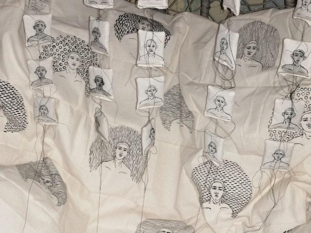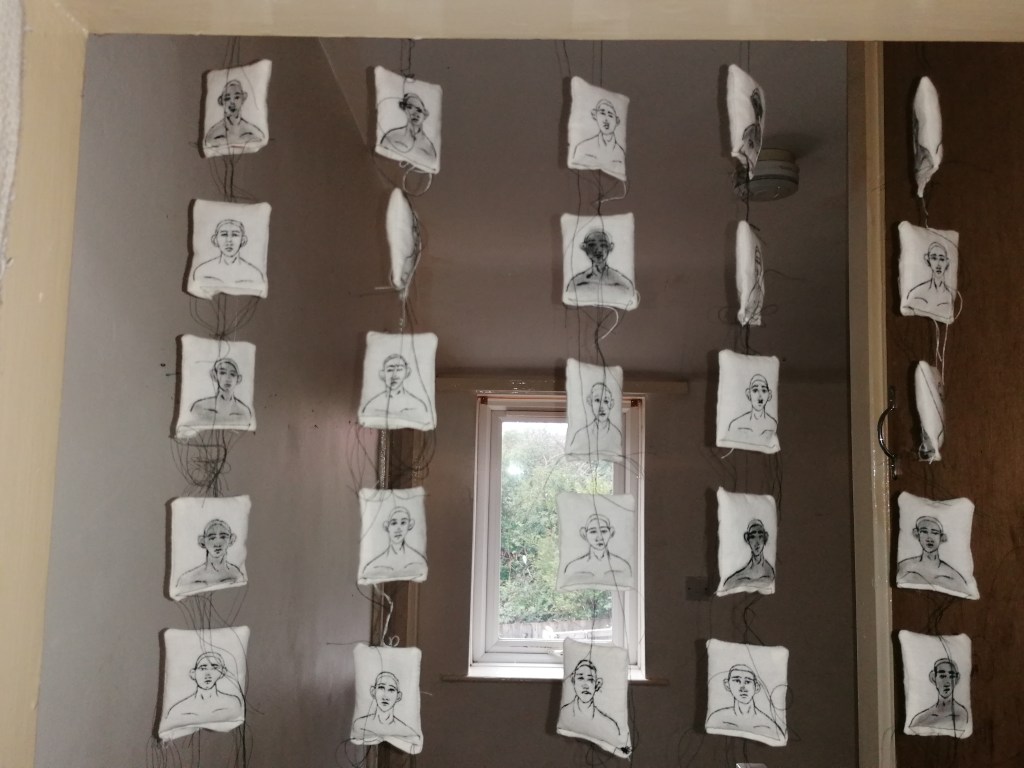 I think in terms of pushing the idea further, If I had the space I would have liked to maybe make a room surrounded with tapestries and blankets to create an overwhelming feeling, that could feel good or bad depending on the person viewing the work. That would put people right into the centre of the work and recreate that surrounding atmosphere of having a huge blanket of sort around you but also having the awareness that in circumstances, that’s how fear is felt to some people. I think that if I was able to use the workshops too, print work would be interesting to use because of the element of using repetitive patterns and portraits, that is something I would have liked to experiment with in this project.