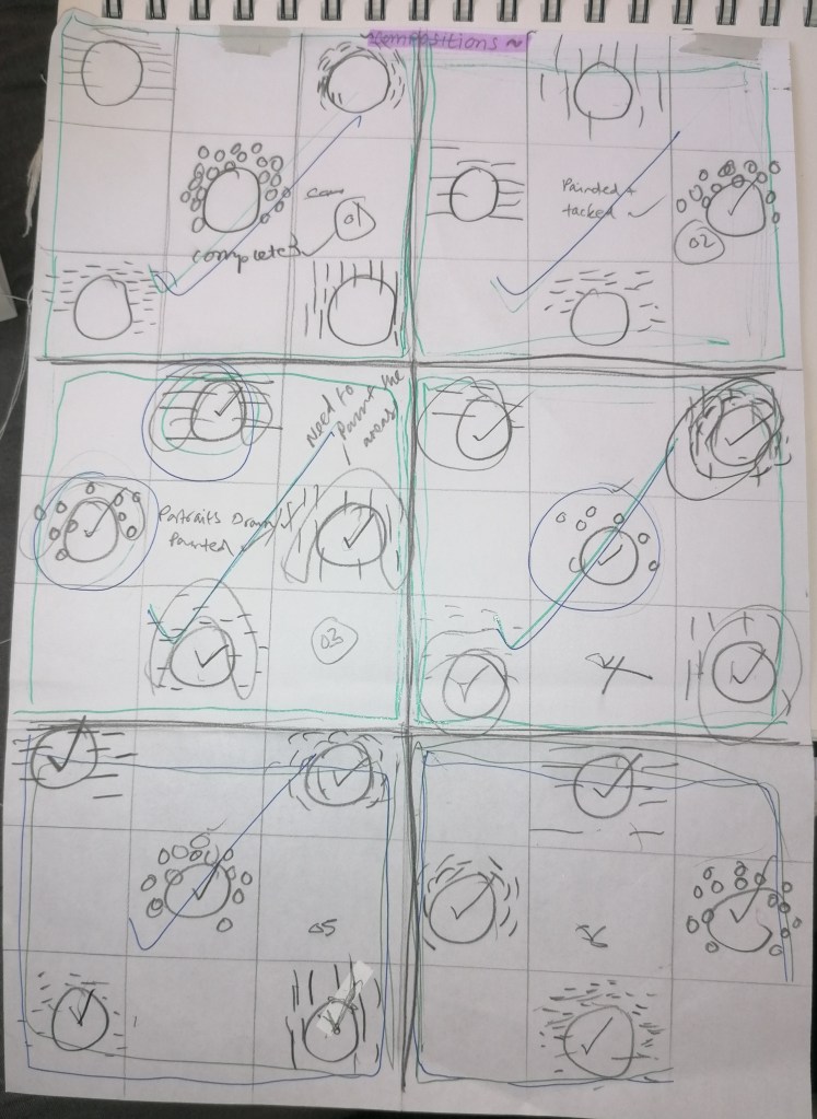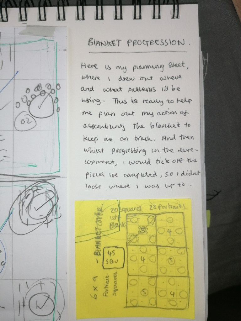 I thought that because I’m making a blanket, I should make a layout plan of how I will produce the piece. So here, I made sketches of what patterns I will be using and what there placements will be when It comes to assembling the blanket together. This way, it helps me stay organised and shows me how many portraits of which pattern I need to make, so I wont produce more than I need and to help me stay slightly organised in the process of things.