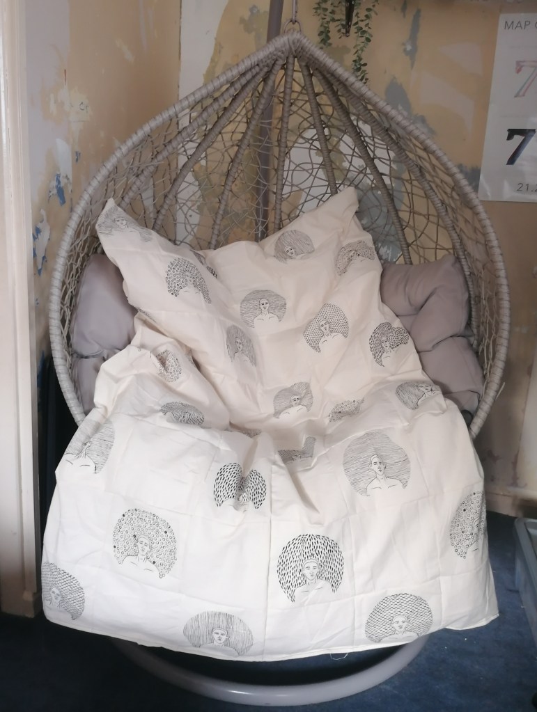 I will post an Image of the blanket on a chair that I think it will look good on, but the bonus is that the chair is my comfort seat for when I’m suffering with my anxiety badly, so with the theme of using fear and my production of a comfort object, the space and outcome work well together.