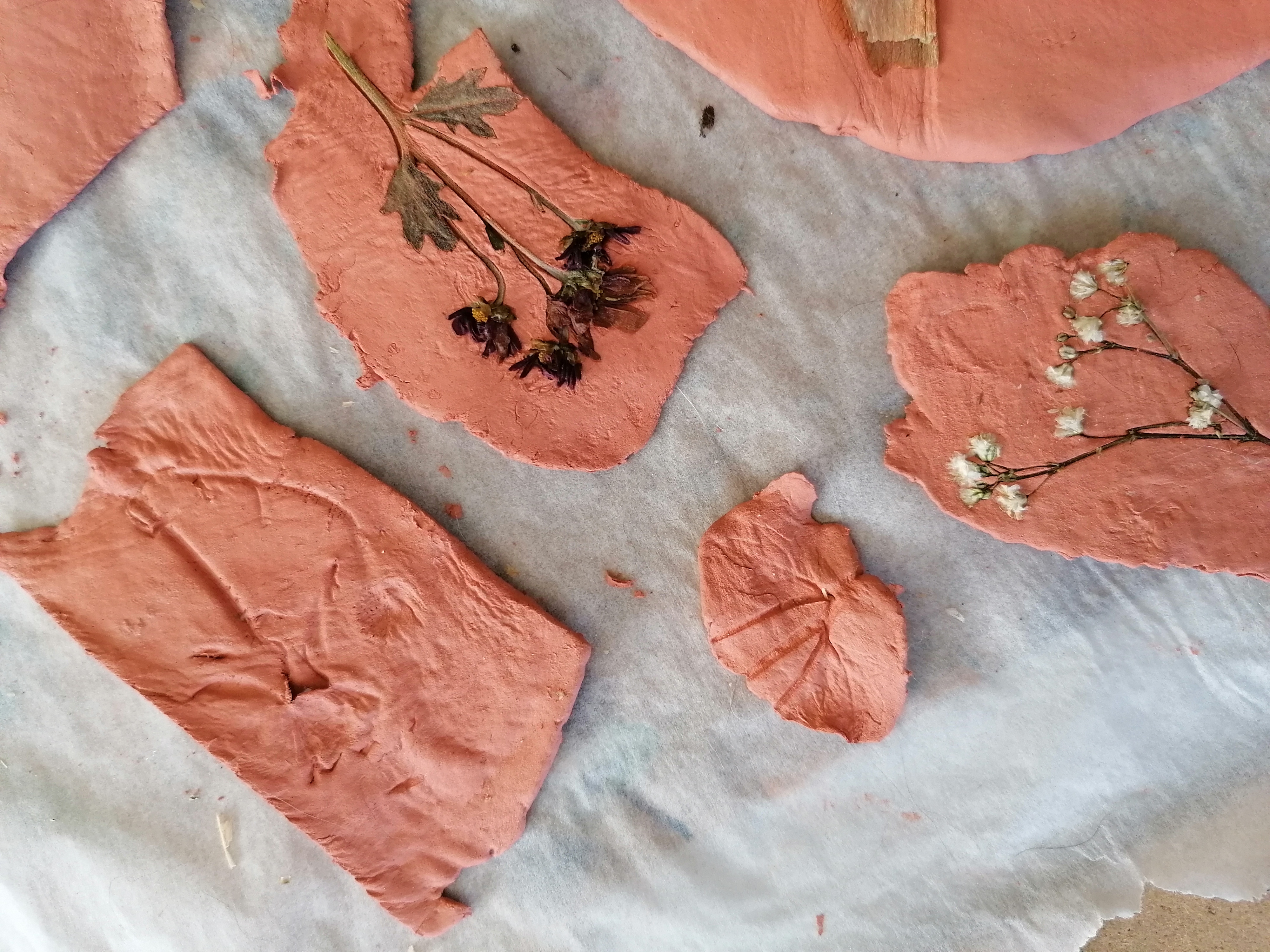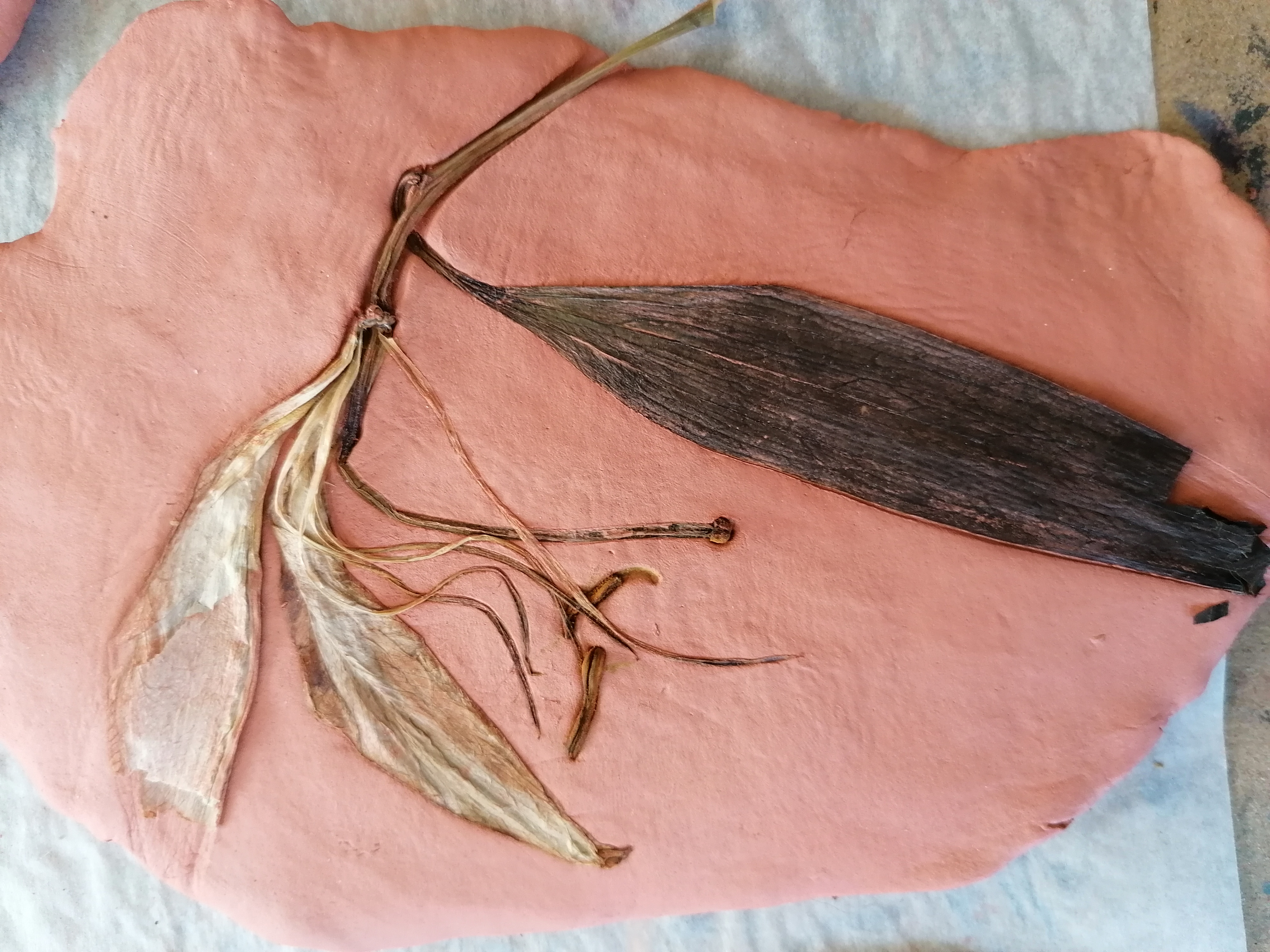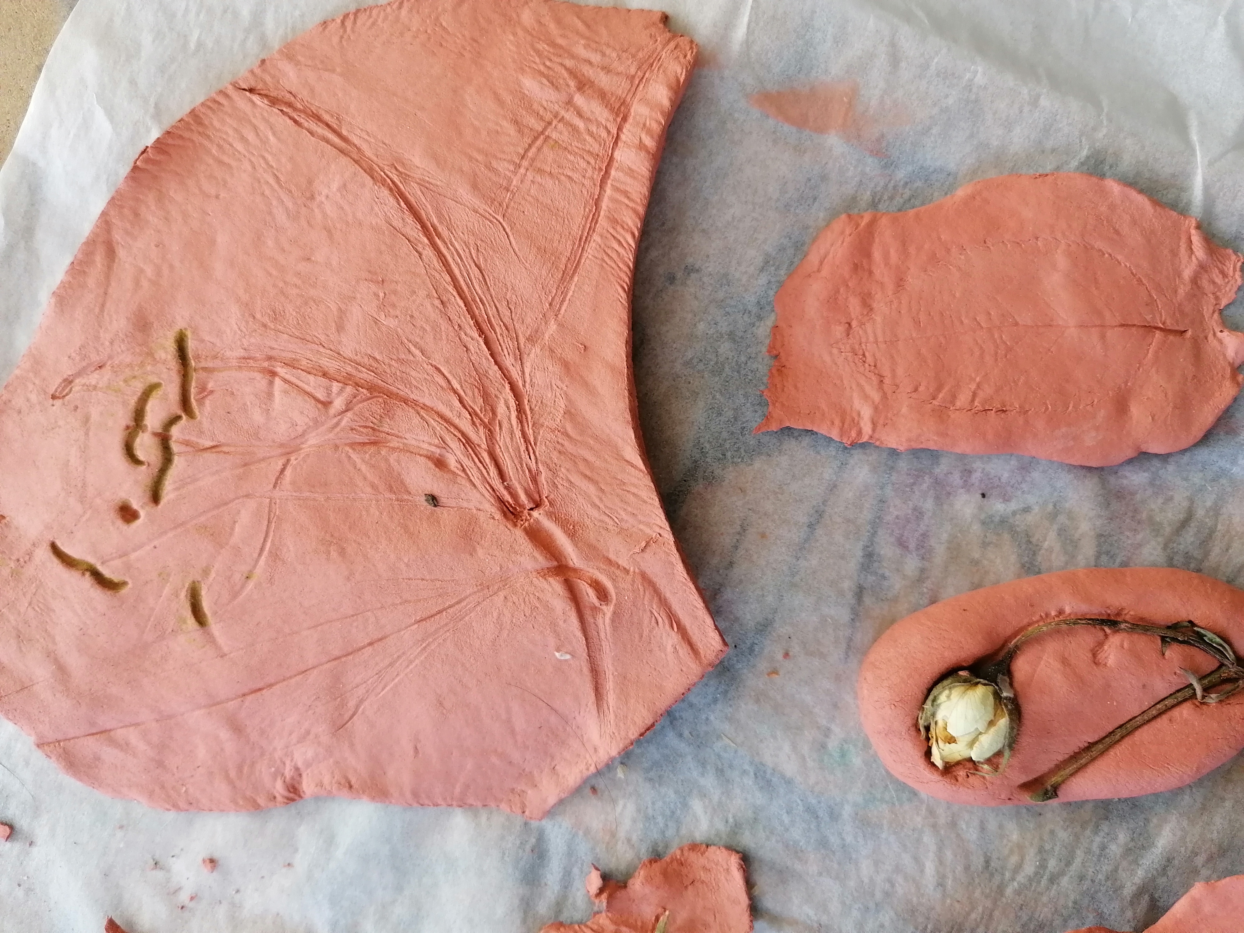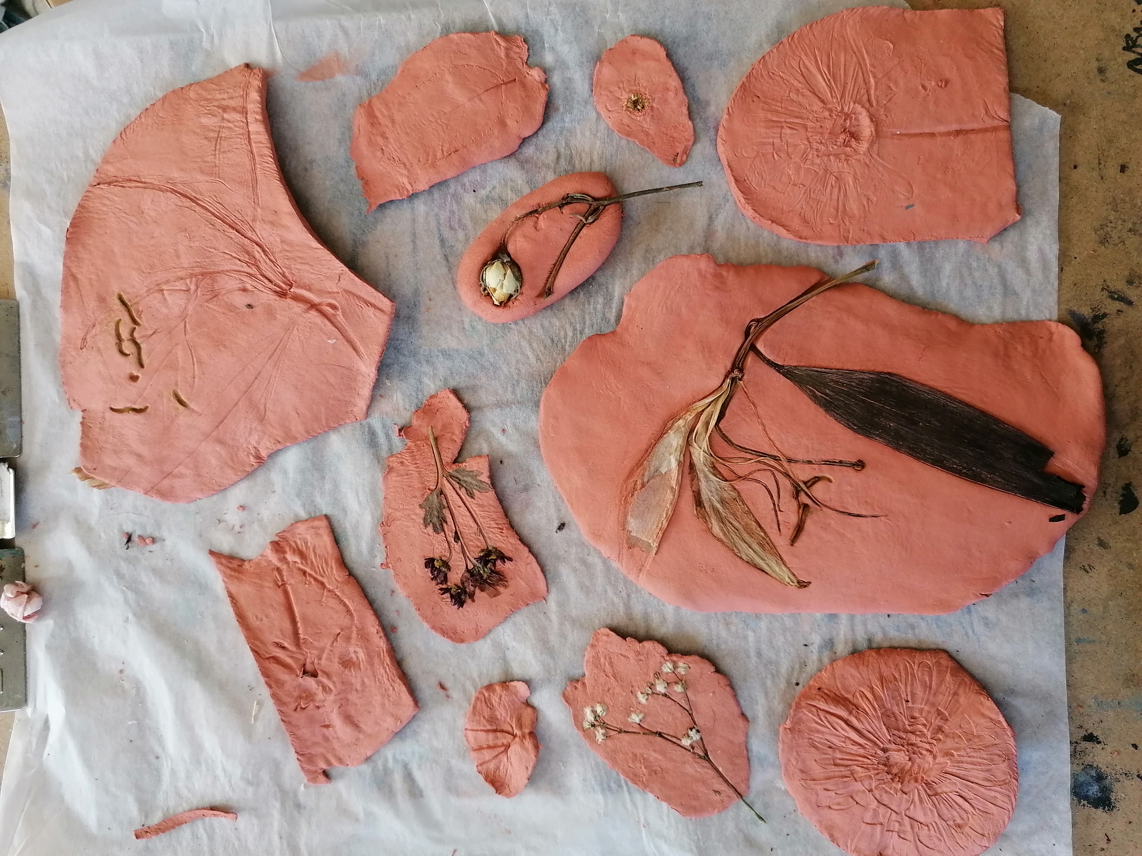 Here I pressed some leaves and flowers into some terracotta air dry clay to see what kinds of outcomes I would get shape wise and textual wise. I was quite pleased with what came out of this experiment, I definitely received many details in textures and shapes, I look forward to how I can produce these further.