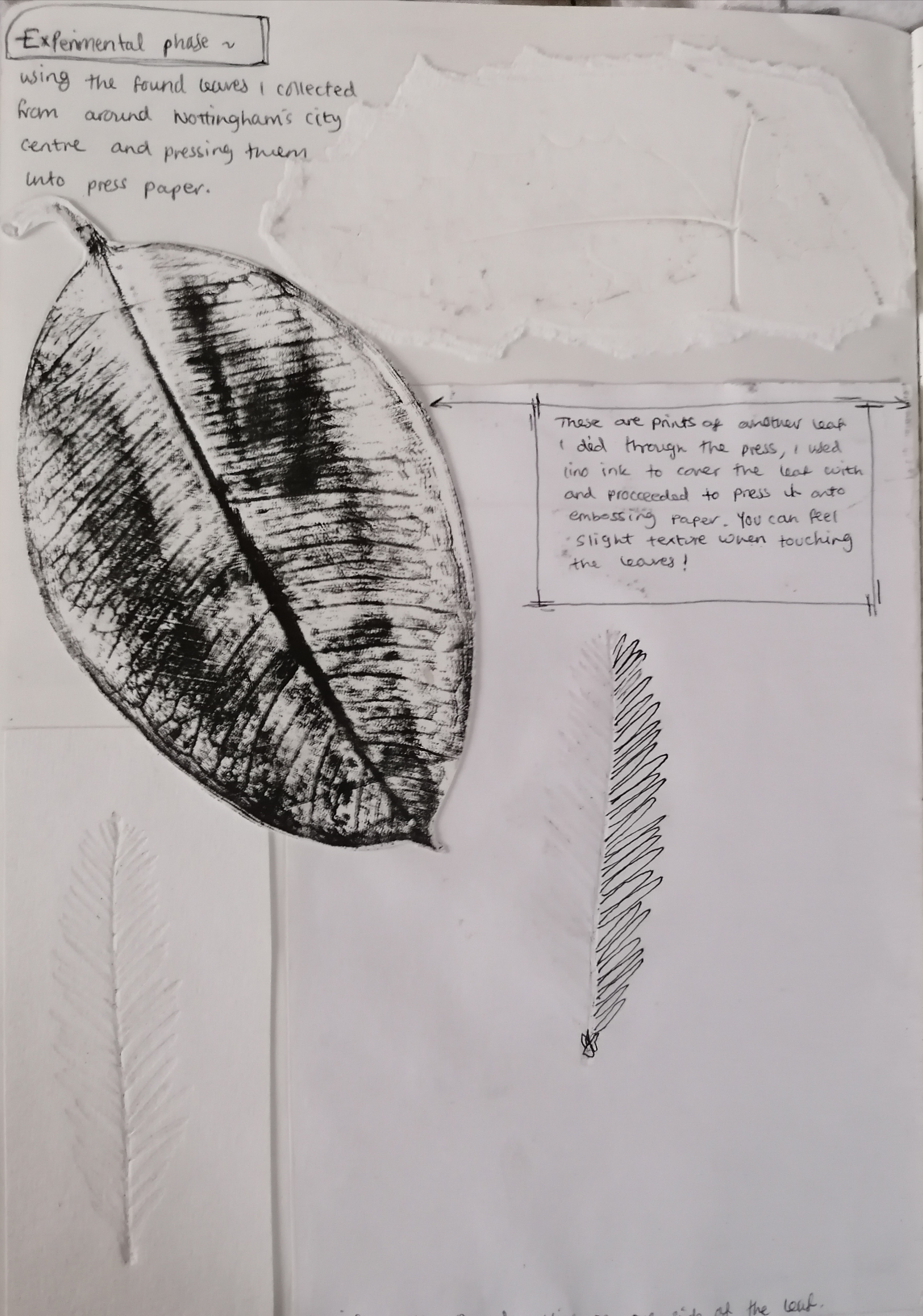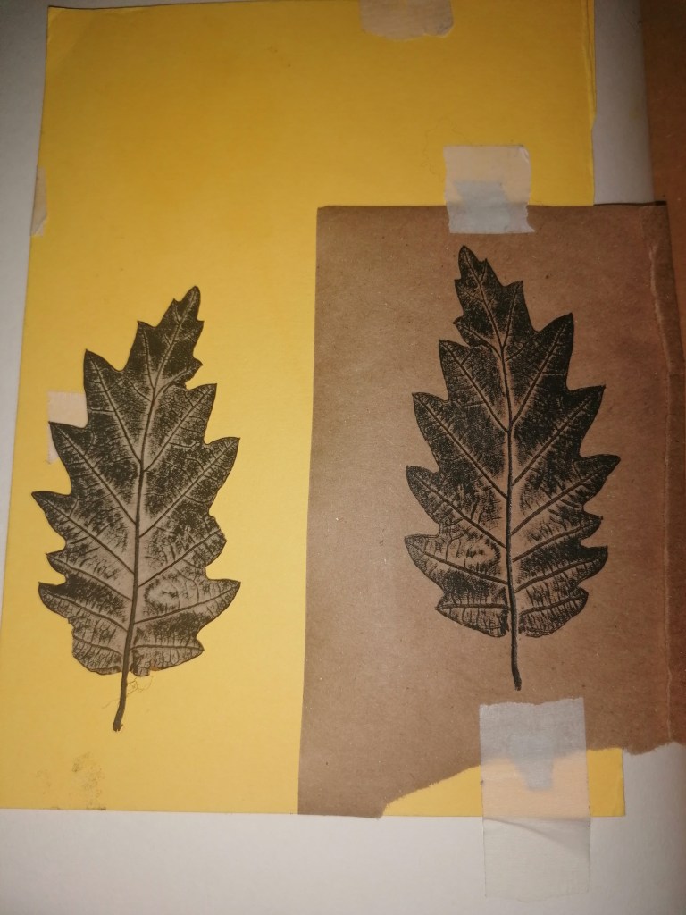 By gathering leaves, I started to play around with what I could do with them. Thinking back to the primary drawings I had done and the simple lines of some, I wanted to see if I could get similar results by print pressing some different, more textual leaves.