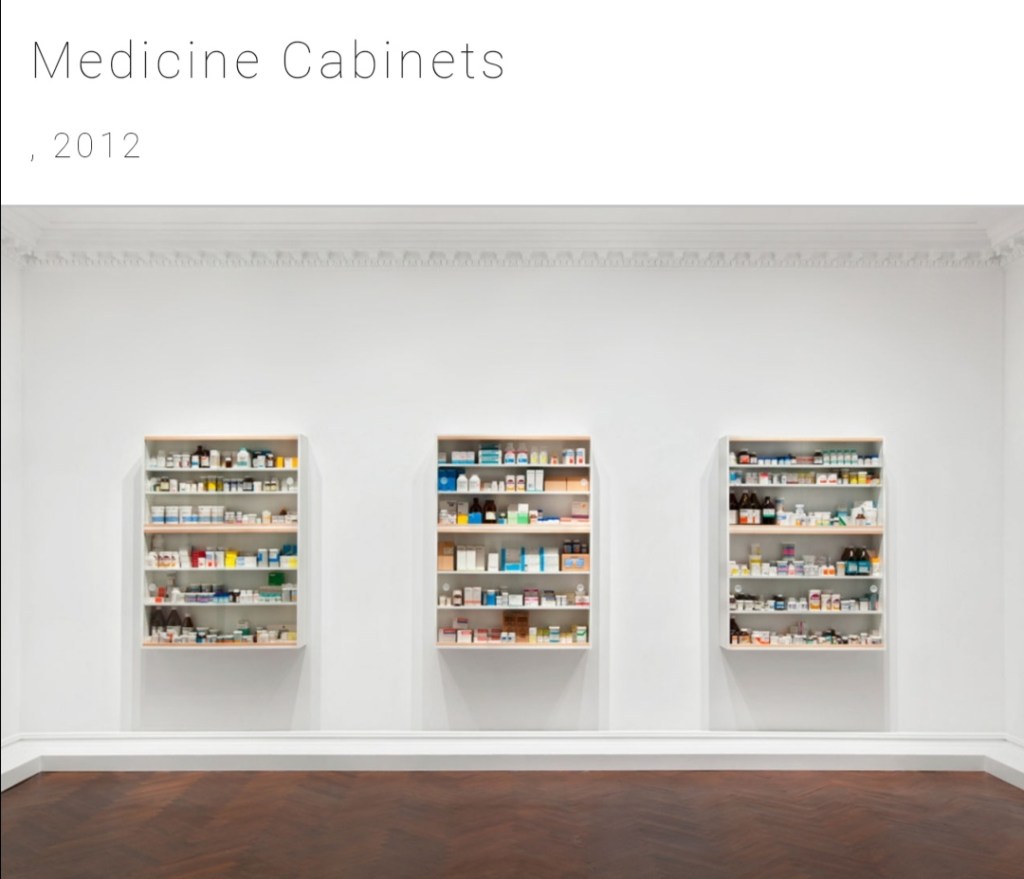 So I wanted to start off by looking at some artist where they use materials and concepts that are relitive to my ideas of what coping mechanisms there are for mental health, and so I thought about what medications are usually prescribed so that’s where Damien Hirst’s Medicine Cabinet came to mind.