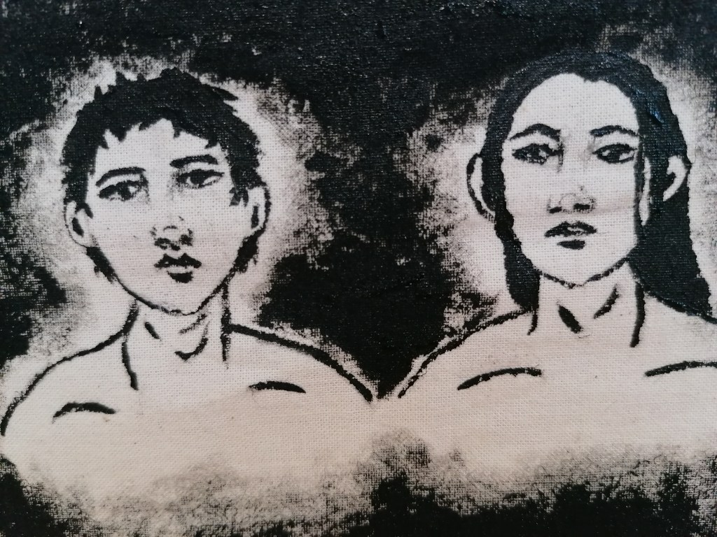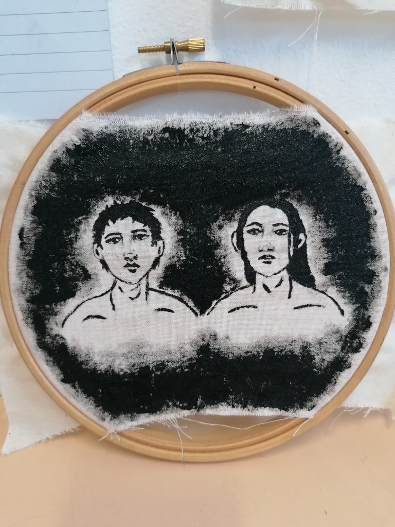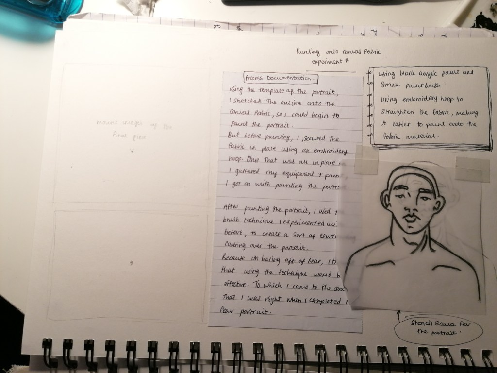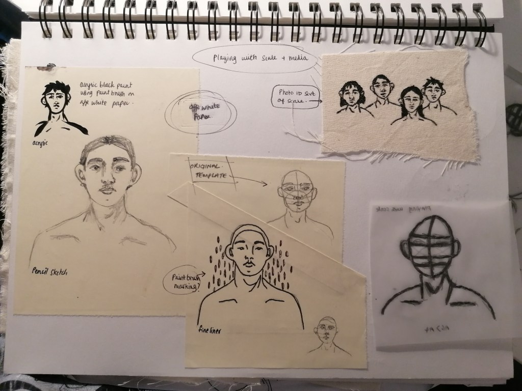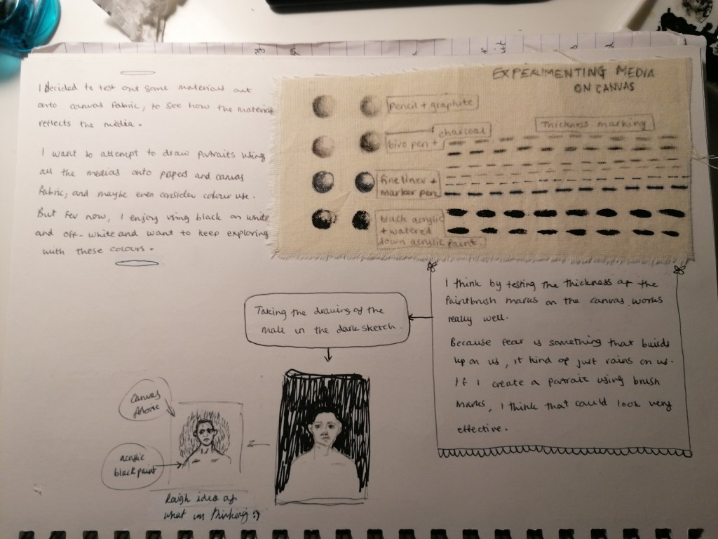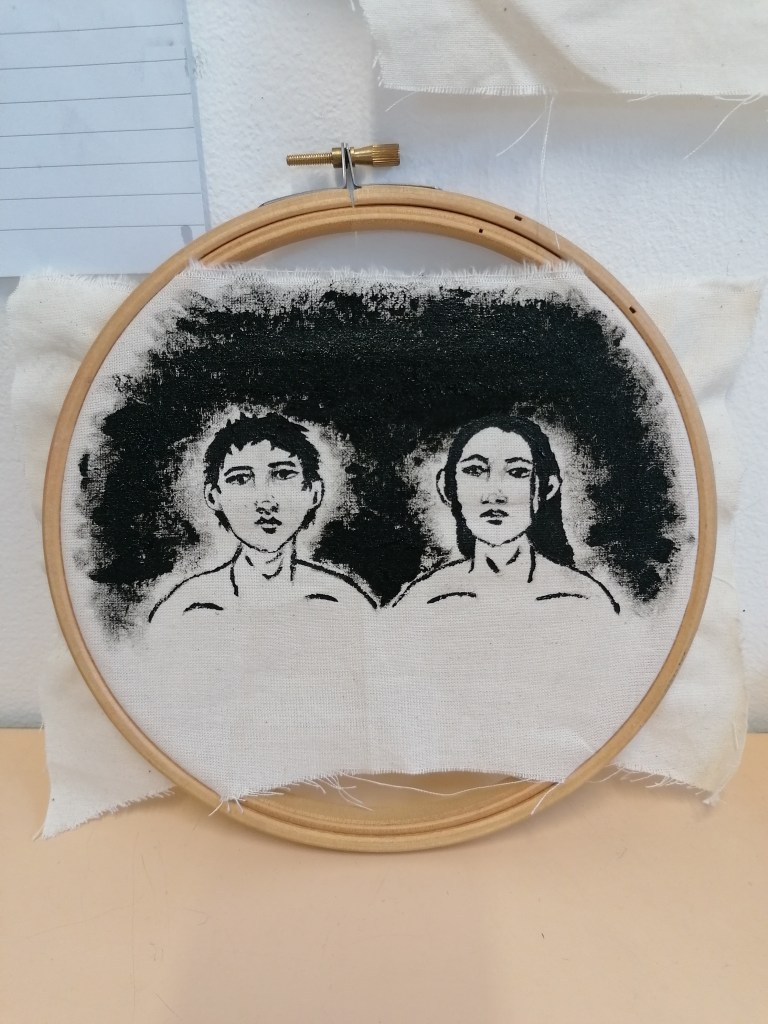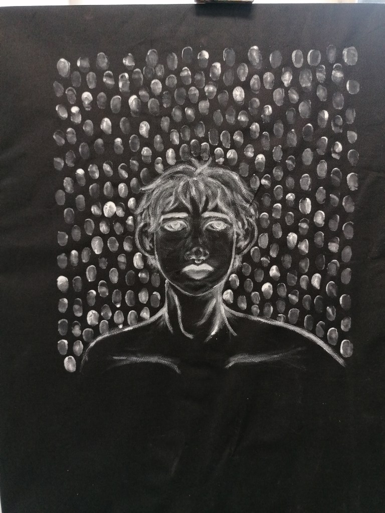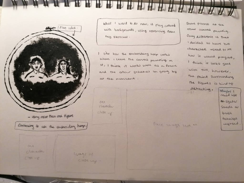 With this portrait, I tried something completely different to what I have been doing so far. What I was trying to interpret in this piece was kind of like a fear version of ourselves? So I made the portraits reflect themselves and painted the in more realistic tones by adding the shading areas and darker tones in places.