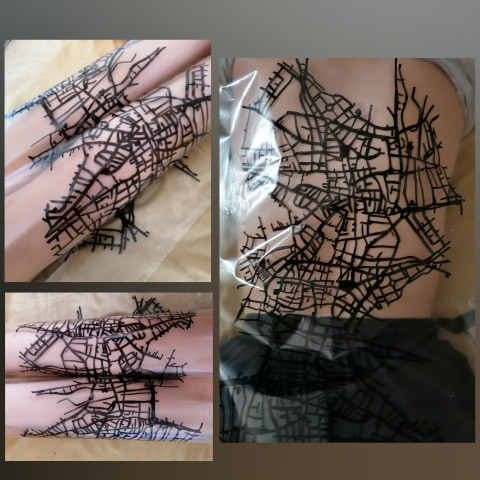 This experiment was made using black thread and another type of dissolvable fabric. The difference is that this one is more plastic like and can dissolve in cold water whereas the other dissolves in hot water. And on the other leg I used a simple fine liner to draw the map lines out.