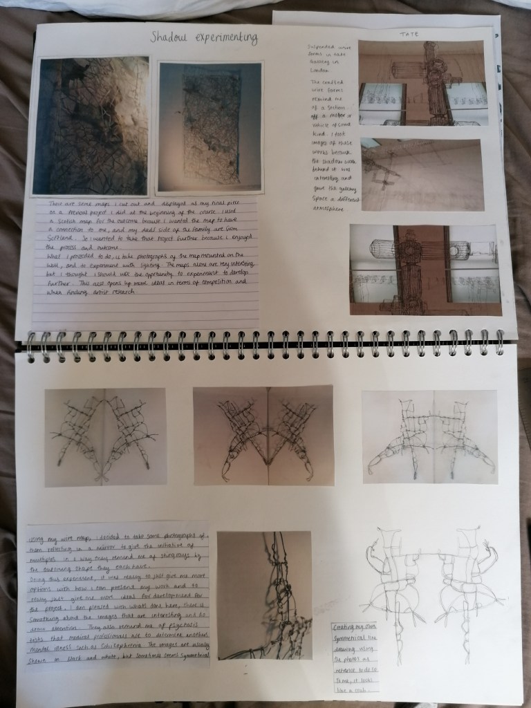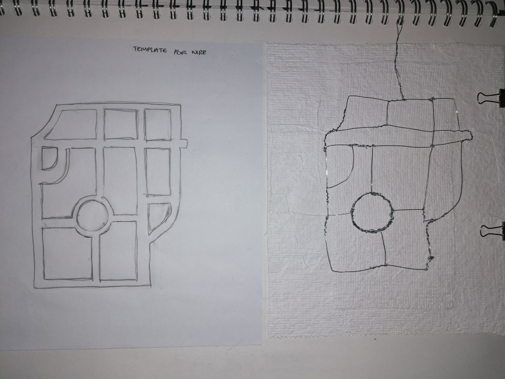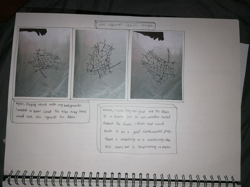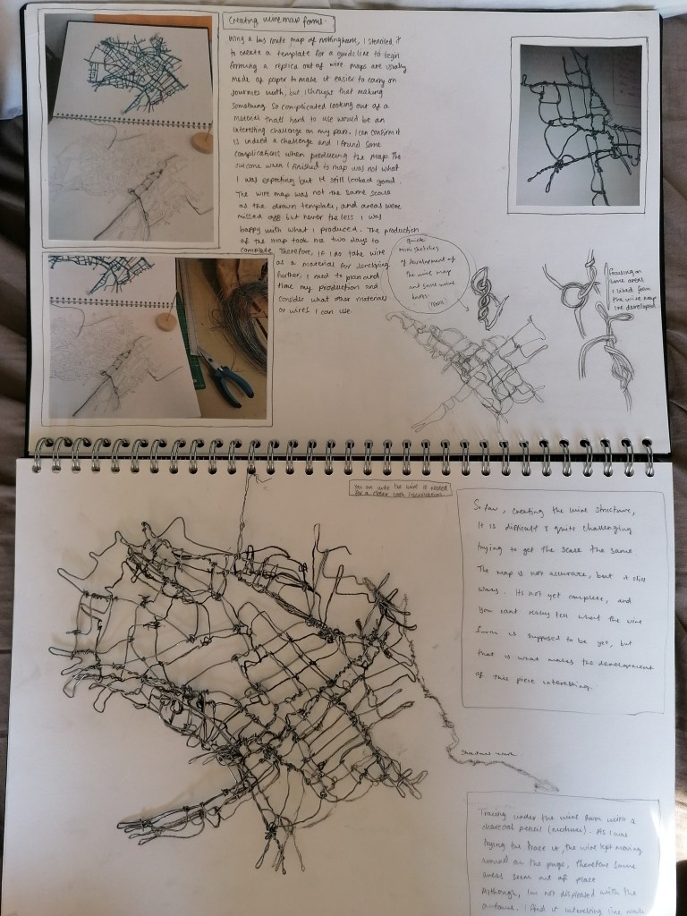 I’ll talk about the meaning in choice of the materials I chose to develop with first before I explain further with the process. So because of the restricted feelings I have to Nottingham, I decided to use a material that I think could link to restraint and that was wire. When I think of wire as a material, I think of wire mess fences and barbed wire, which both have a purpose of keeping things in or out. The wire I’ve been using is a metal aluminium wire, metal is a strong and usually heavy material, so I wanted to depict that and use wire as a visual way to place my views on Nottingham and what the effects the area has had on me and my family.