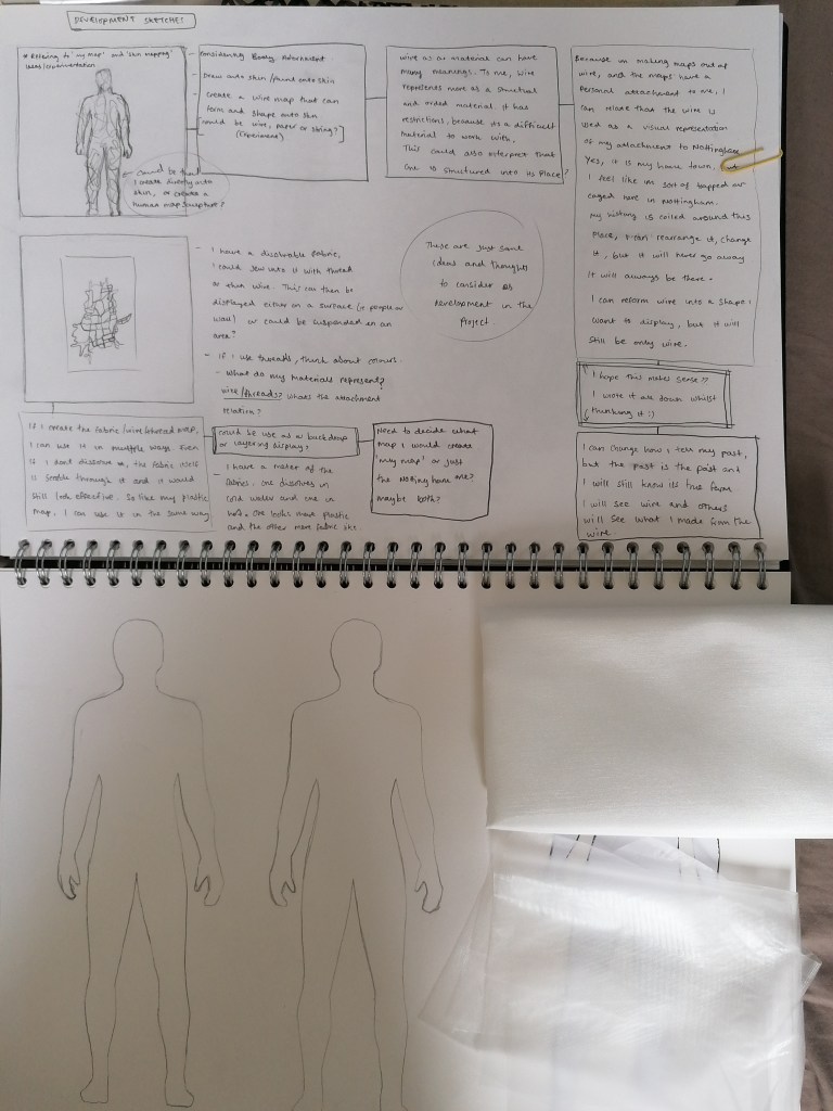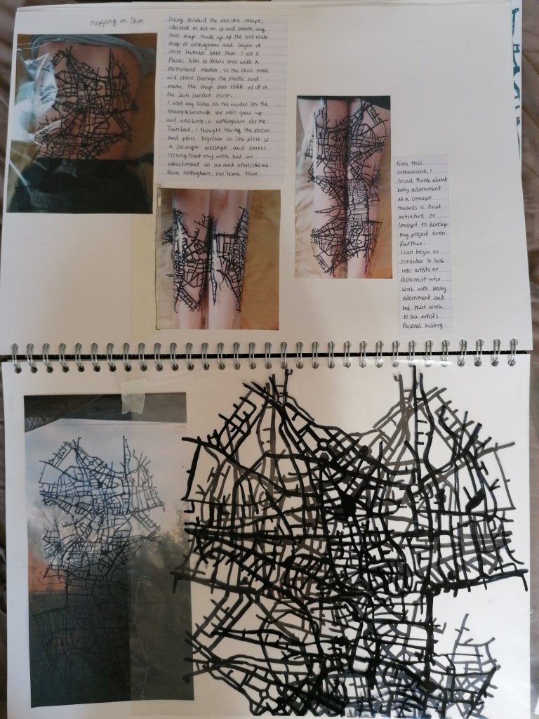 These pages are for me to grasps some ideas on how to move forward in the project, I’m interested in developing around the idea of using the body with my maps. I think it makes an interesting concept to consider, but I also want create something that can be displayed without a body too.