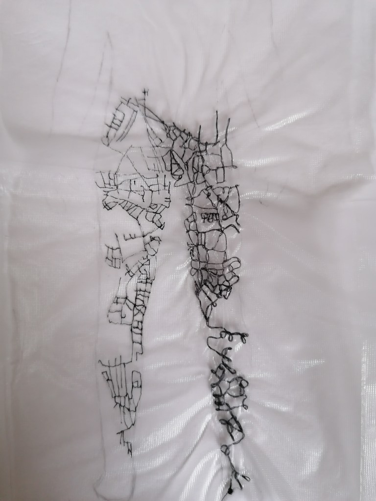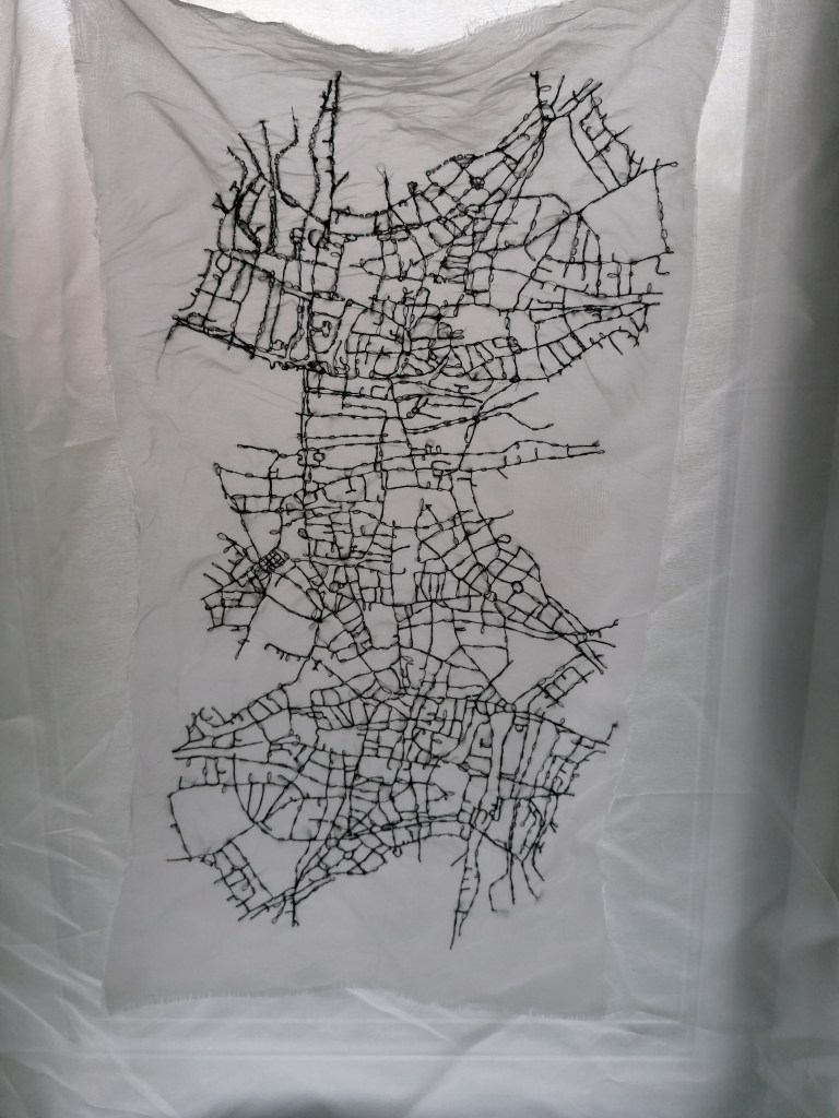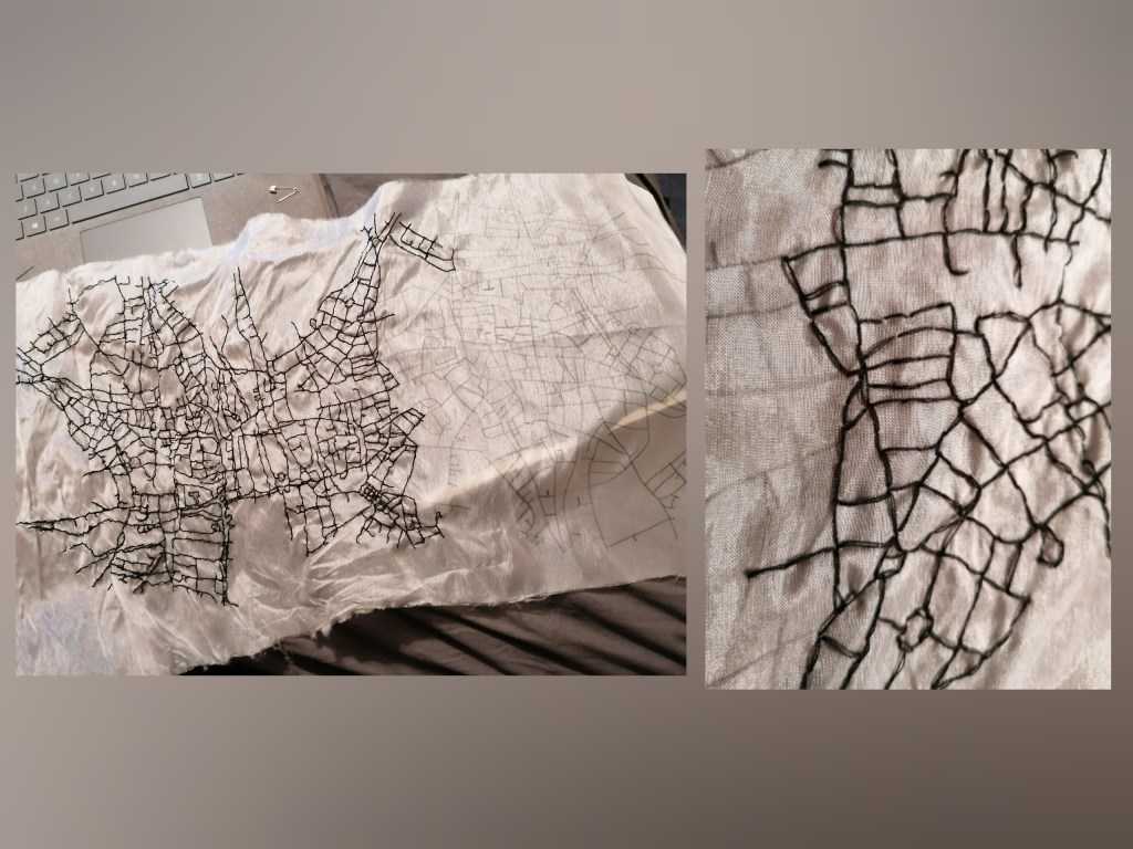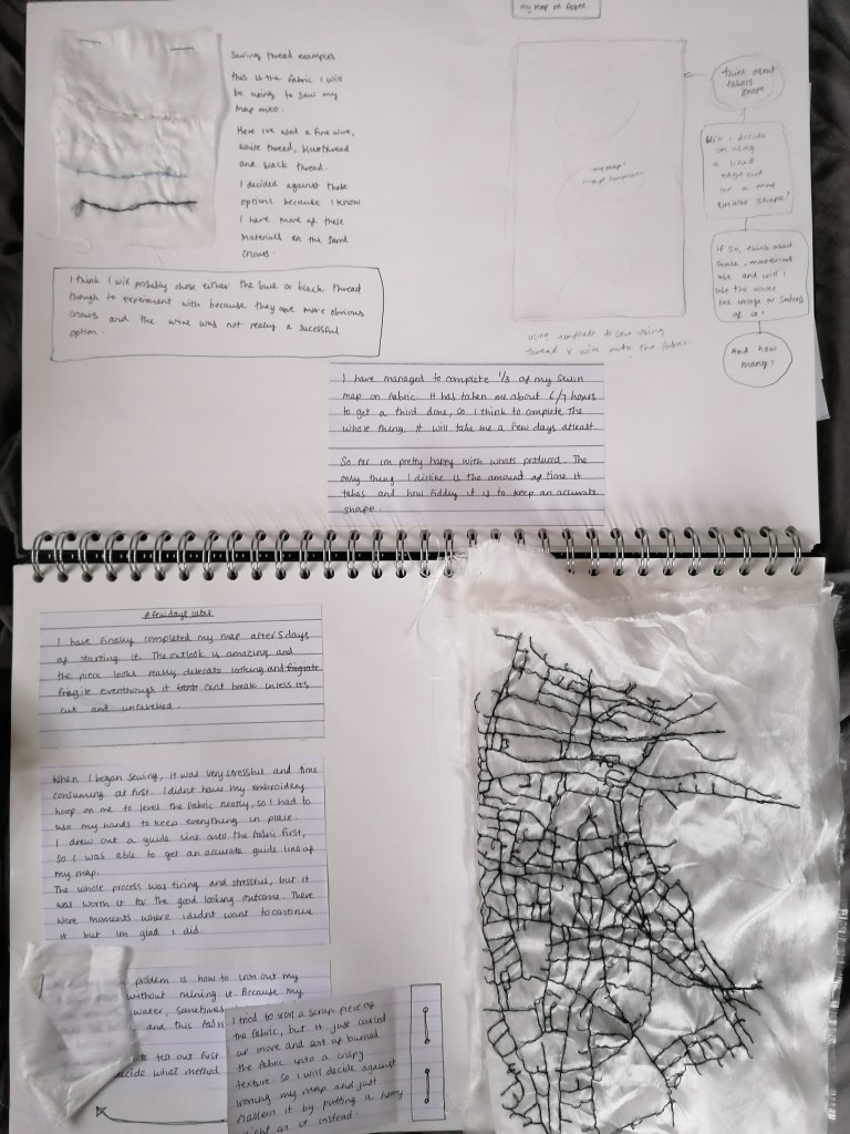 Taking forward ‘my map’, I decided to sew the intricate map onto a fabric that can dissolve using black thread. The map took me a total of 5 days to complete due to me having to hand sew, and measures to just over A3 scale.