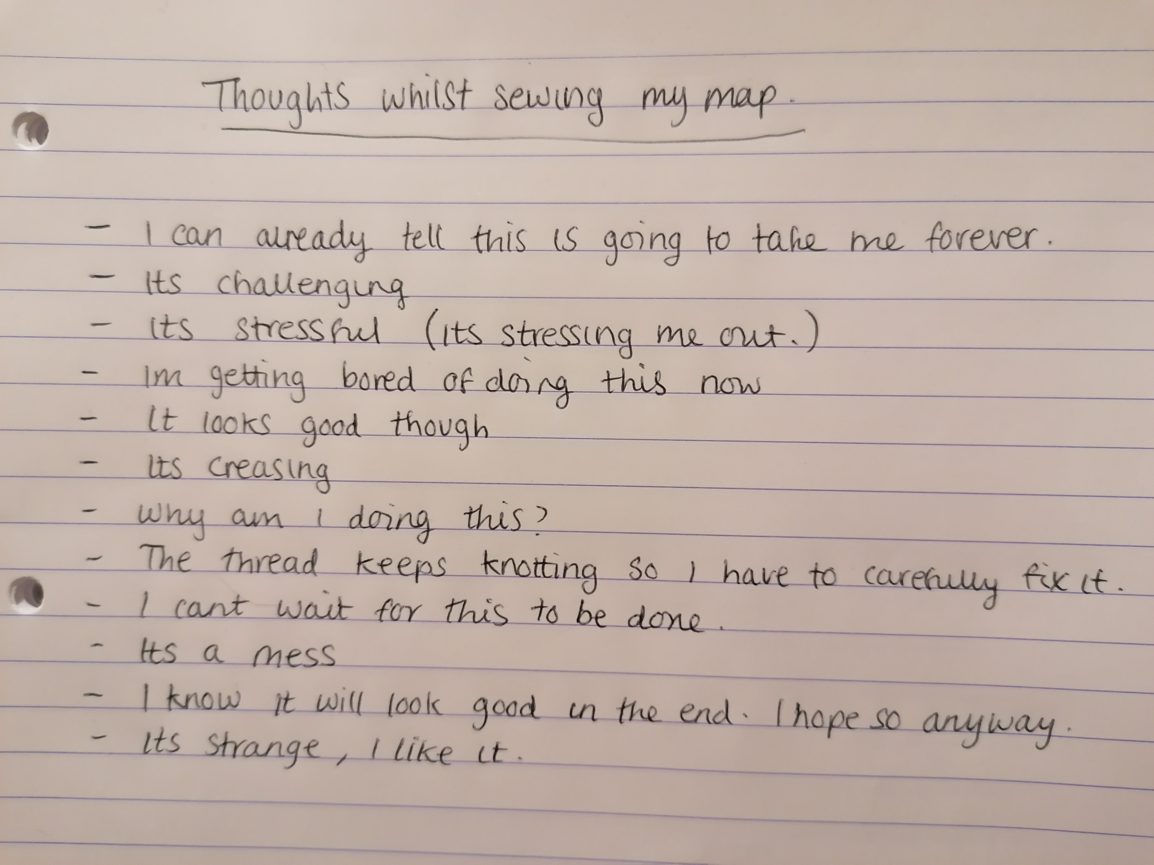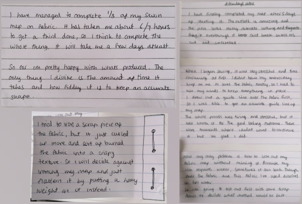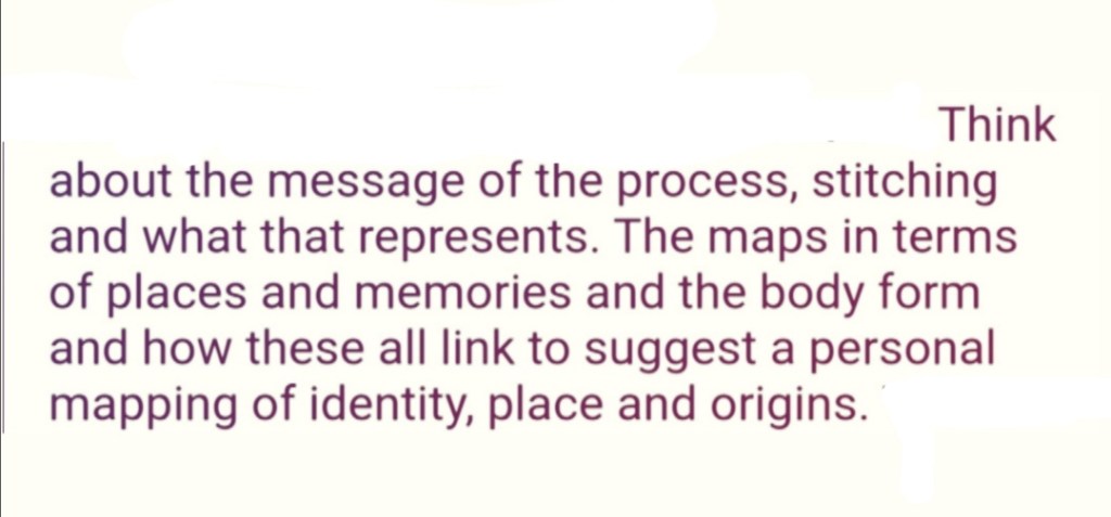 Moving onto the process of using a hand sewing technique. there’s something about hand sewing that to me gives whatever it is you’re making, more meaning. When hand sewing, a lot of consideration and patience has to go into it when you’re doing it. Patience and consideration are things I’ve always had to think about and skills I developed whilst growing up as a kid. was sewing my map I came across some difficulties and worked around them, and there were moments where I felt annoyed with what I was doing. And when I think about the process of me developing the sewn map, I was thinking that the process in short is how I could explain my thoughts from my upbringing at that time in less detail.